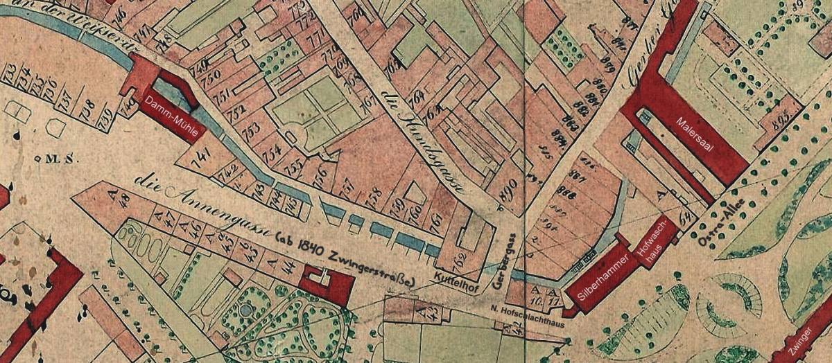 Errichtung vor 1500 als Schlachthaus des Dresdner Hofes am Weißeritzmühlgraben