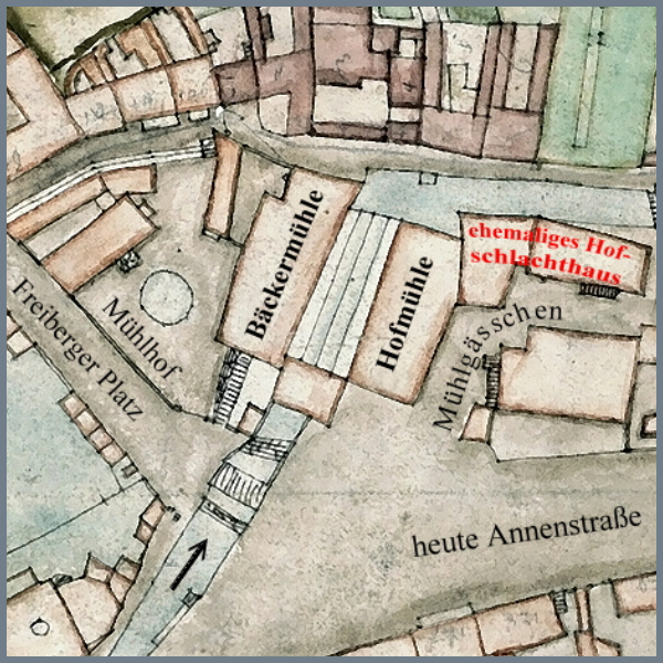 errichtet am Weißeritzmühlgraben als Schlachthaus für die auswärtigen, nicht der Dresdner Innung